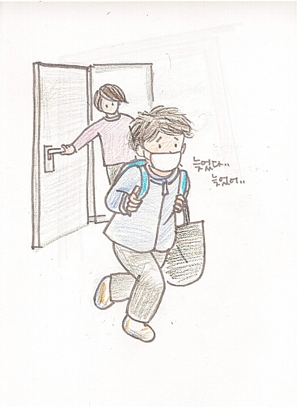 헐레벌떡 학교로 뛰어나가는 아이의 뒷모습에서